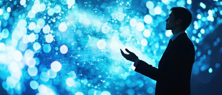 A business professional suit gestures during presentation with abstract blue graphics background, conveying innovation and ideas
