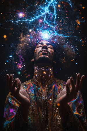 A man stands with his head tilted upward, glowing brilliantly against a backdrop of swirling colors and vibrant lights, embodying a sense of wonder and connection to the universe.