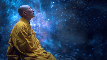 A monk sits peacefully in meditation wearing a yellow robe. The background features a stunning cosmic scene filled with colorful stars and galaxies creating a serene atmosphere.