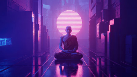 A bald monk in saffron robes sits in a lotus position, meditating. He is surrounded by a futuristic city with geometric buildings bathed in vibrant purple and pink neon light. A large, glowing, horizontally striped circle, resembling a sun, is positioned behind him, casting a soft, diffused light. The ground is reflective, mirroring the neon lights and the monk's form.