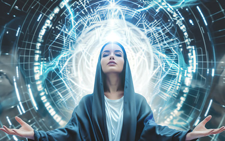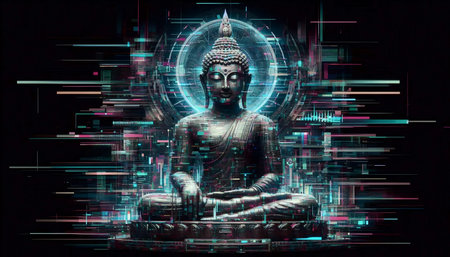 A serene figure of Buddha meditates above a glowing circuit board, embodying a blend of spirituality and technology.