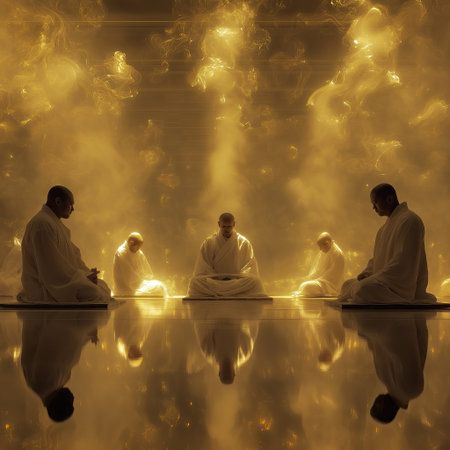 Monks in white robes meditate in serene, golden hued environment, surrounded by ethereal smoke, creating peaceful and spiritual atmosphere
