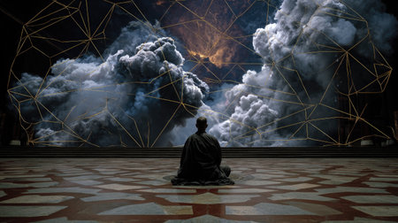 Lone individual dressed in dark robes sits in deep meditation on an intricately tiled floor, facing a massive, turbulent cloud formation filling the background. This chaotic natural event appears framed and contained within an illuminated, golden, three-dimensional geometric wireframe structure, suggesting a confrontation between raw power and structured thought or cosmic order.