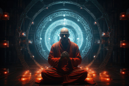 A serene monk sits in meditation with his eyes closed, surrounded by bright blue and orange lights. The lights are scattered throughout the background, creating a magical and ethereal atmosphere. The monks orange robes stand out against the dark background, and his calm expression suggests a state of deep peace and tranquility.