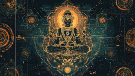 A golden figure in a meditative pose radiates serene energy within a geometrically complex, shimmering backdrop.