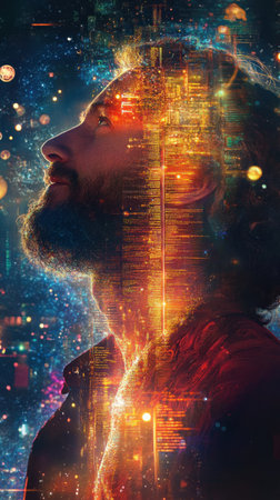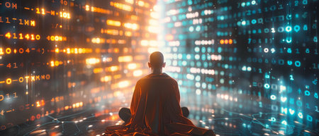 Virtual Monk, Binary Cloak, Contemplating infinity, Surrounded by glowing code, Realistic image, Spotlight, Double Exposure Effect, Split screen view