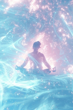 A serene figure sits in a peaceful meditation pose, exuding calmness amidst a backdrop of swirling colors and light. The atmosphere feels mystical and inviting, capturing a moment of inner peace.