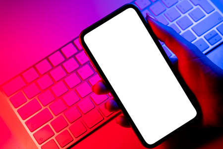Smartphone mockup in woman hand in blue and pink tones. Frameless smartphone mock up with blank white screen. Empty space for text. Copy space. Isolated white screen with clipping path