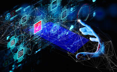 Electronic motherboard, isometric processor microchip of mobile phone, digital communication, people and technologies, digital life