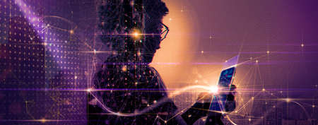 Digital technology, internet network connection, futristic innovation technology.double exposure businesswoman using mobile phone and smart city with internet network future technology.