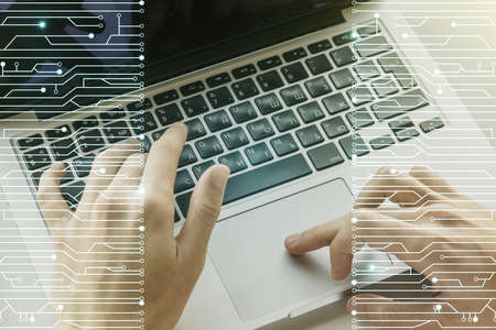 Double exposure of circuit hologram and hands typing on laptop on background. Research and development hardware concept