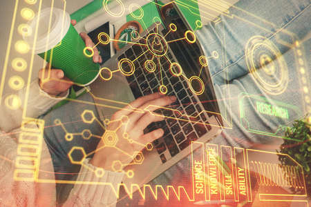 Double exposure of data internet theme hologram with man working on computer on background. Concept of innovation.