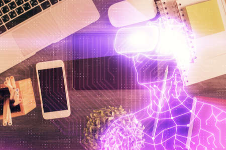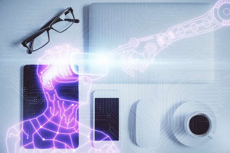 Double exposure of drawing man in AR glasses over table with phone. Top view. VR concept.