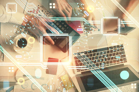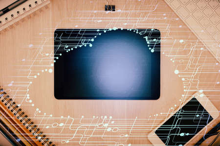 Multi exposure of technology theme drawing over work table desktop. Top view. Global data analysis concept.