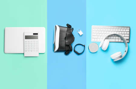 Different modern devices on color background