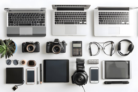 A collection of modern tech gadgets isolated on a white background.