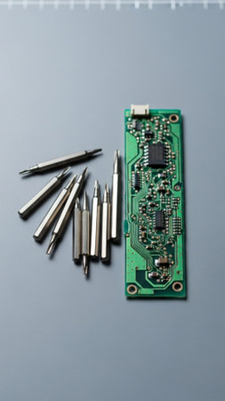 Electronics circuit board with microchips and tools, top view