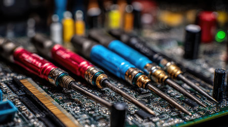 Close-up view of colorful screwdrivers laid out on a circuit board, showcasing essential tools for electronic repair and maintenance in a crafting workspace.