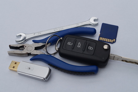 Locksmith's table with keys and tools for the repair of mechanical equipment. Car workshop.