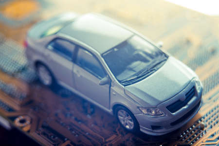 Toy cars on electronic board and microchip. Conceptual image for semiconductor shortage disrupting production of the automotive industry.