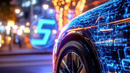 A stunning futuristic car adorned with neon lights and digital effects, set against a dark background. This image highlights innovation and modern automotive design.