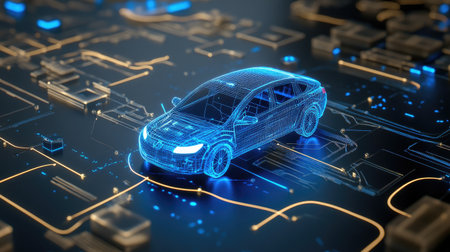 hologram of 3d model of electric car on circuit board, futuristic transportation concept, electronics in auto industry, holographic modern design. High quality photo