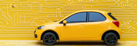 Yellow Car on Circuit Board Background Ride-Hailing, Connectivity, Technology in Transportation
