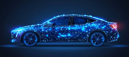 A futuristic smart car is surrounded by glowing data lines, showcasing the blend of technology and innovation in transportation. The design highlights connectivity and energy efficiency in a modern urban environment.