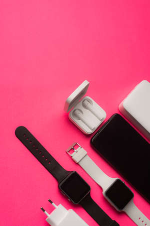 Layout of modern gadgets on a pink background. Online communication. Internet connection. Mobile communication. 5g. Black and white technology. Modern technologies. Copy space
