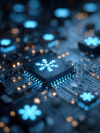 Close-up of a circuit board featuring a glowing snowflake chip surrounded by vibrant blue lights, highlighting technology and innovation.