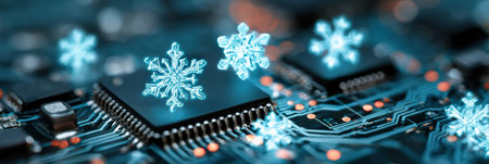Snowflakes appear above a circuit board, blending winter elements with modern technology, highlighting the fusion of nature and innovation in an artistic way.