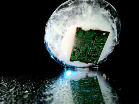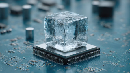 A transparent ice cube rests on a microchip, symbolizing innovative cooling solutions in technology. This image conveys ideas of efficiency and modern design in electronics.