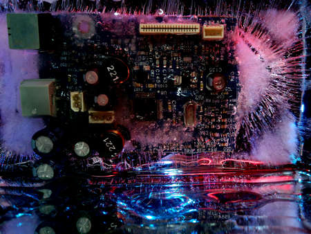 creative photo of an electrical circuit in ice glowing like city lights at night