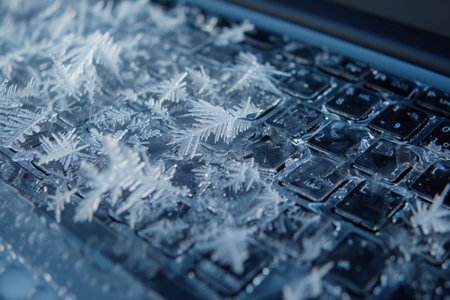 Tiny frost crystals blanket a keyboard, transforming the everyday into a frozen wonderland as morning light gently illuminates the intricate ice patterns, showcasing nature's artistry.
