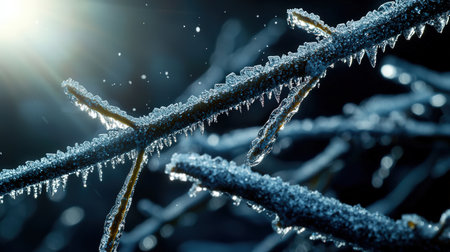 A detailed shot of frosted pine branches with tiny icicles sparkling in the sun
