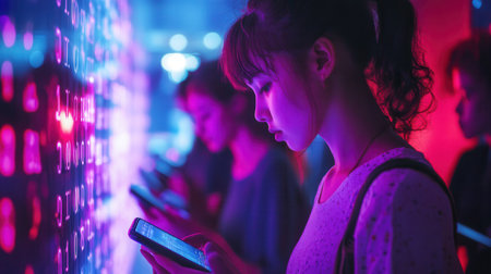 People with bowed heads focus on their smartphone screens, surrounded by vibrant digital numbers, creating a feeling of isolation.
