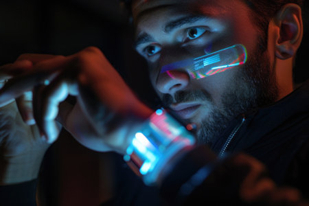 Thoughtful man with futuristic holographic interface projected from his smartwatch, conceptualizing high-tech wearable technology. A.I.