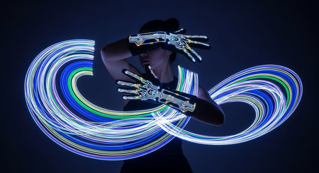 A low-angle close-up shot captures a woman's face partially obscured by vibrant, swirling neon lights. The colorful streaks of light create a dynamic and ethereal effect around her head and shoulders.