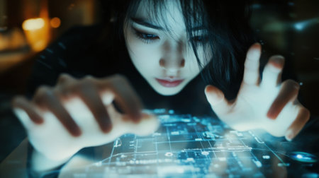 A female data scientist deeply focused on data analysis with digital patterns projected on her face in a high-tech environment