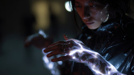 A individual interacts with a luminous handheld device amid bold, colorful lighting, evoking a high-tech ambiance for exploration, entertainment, or communication.