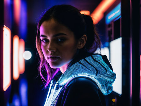 photo of woman in black hoodie in server data center room with neon light, generative AI
