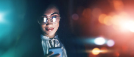 Businesswoman, phone and communication at night for texting, chatting or networking on dark background. Female employee smile holding smartphone working late for online planning strategy on mockup