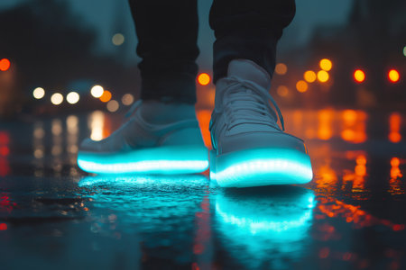Close up of glowing sneakers reflecting on wet asphalt at night, creating a futuristic and stylish look