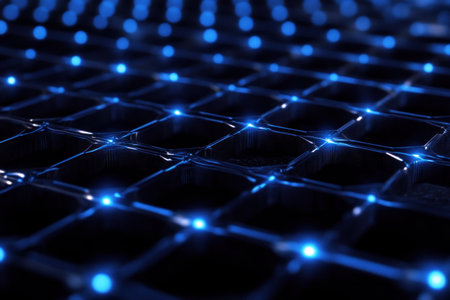 An abstract digital illustration showcases a grid of interconnected glowing nodes. The image displays a cool blue color palette with a modern aesthetic, possibly representing data flow or a network. The composition is likely suitable for various applications, including website design or editorial uses related to technology.
