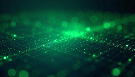 This image features a digital network of interconnected nodes and lines, creating a grid-like pattern. The visual characteristics include vibrant colors like blue, green, and yellow, blending into a gradient across the image. The composition suggests a sense of depth. This image can be used for technology, data, or communication purposes.