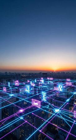 This abstract image showcases a futuristic technology network with glowing elements set against a vibrant background, perfect for innovative projects.