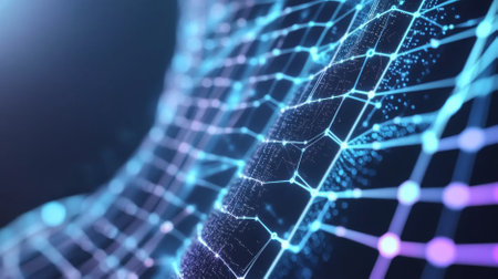 Explore an abstract digital landscape featuring glowing nodes and intricate network connections against a dark background, creating a futuristic atmosphere.