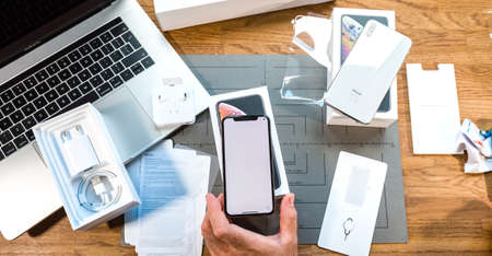 PARIS, FRANCE - SEPTEMBER 21, 2018: Apple fan boy unboxing latest new Apple Iphone Xs Max flagship smartphone mobile phone model from Apple Computers accesories unboxing white screen
