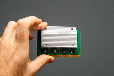 Paris, France - Apr 9, 2019: Man hand holding in hand HP 407748-001, Voltage Regulator Module for Proliant server front part gray bakground