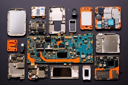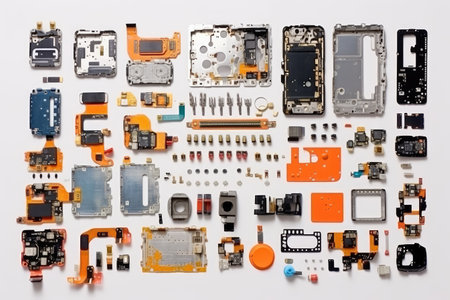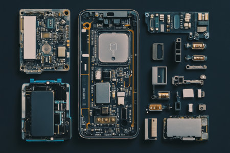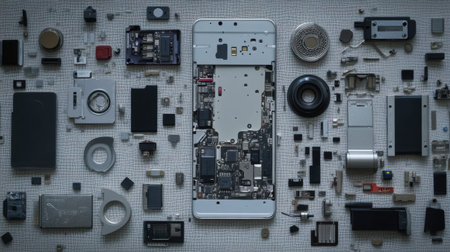 Intricate smartphone components displayed on flat surface, showing advanced internal technology